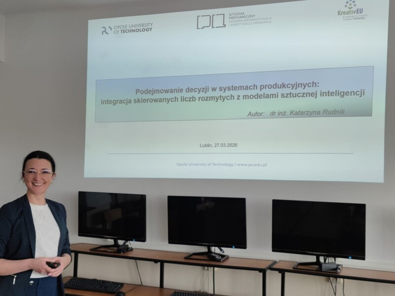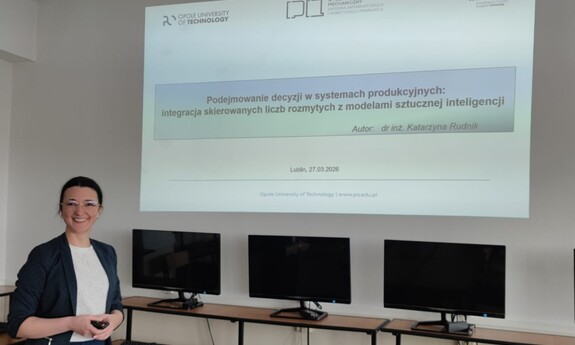 W dniu 27 marca 2026 odbyło się seminarium naukowe Pani dr inż. Katarzyny Rudnik – pracownika badawczo dydaktycznego Katedry Zarządzania i Inżynierii Produkcji Politechniki Opolskiej, odbywającej staż naukowy w Katedrze Informatyzacji i Robotyzacji Produkcji. Pani Doktor wygłosiła referat na temat: Podejmowanie decyzji w systemach produkcyjnych: integracja skierowanych licz rozmytych z modelami sztucznej inteligencji.